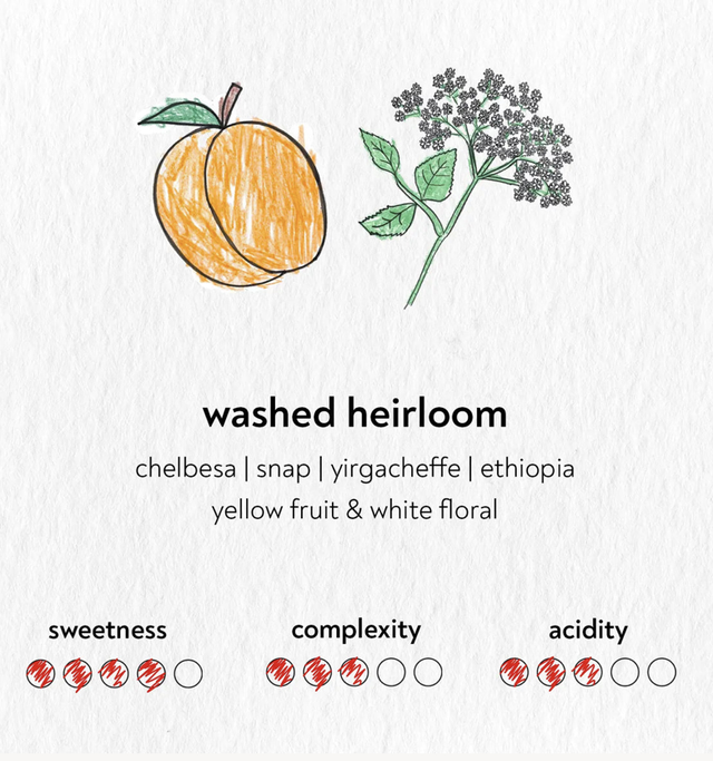 This coffee from Chelbesa farm in Ethiopia features the Heirloom varietal and is processed using the washed method. It offers a vibrant flavor profile with notes of yellow fruit and white floral, delivering a bright and elegant cup that showcases the unique characteristics of the Yirgacheffe region. We think it‘s even more floral and complex than last year.